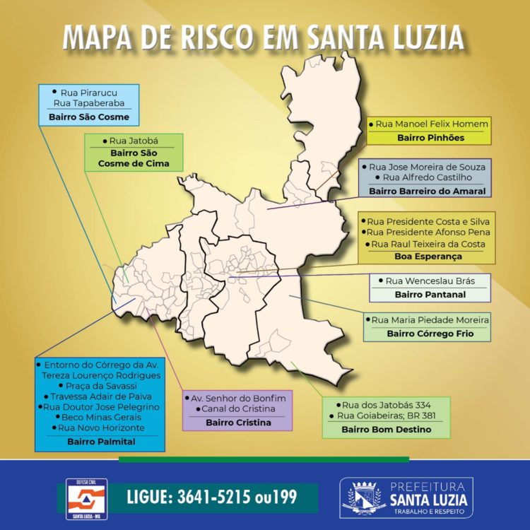 Em caso de emergências, ligue para a Defesa Civil (31) 3641-5215 ou 199. O celular é (31) 9 9187-6329.