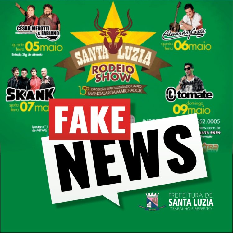 Está circulando nas redes sociais uma notícia falsa sobre a 15ª Exposição Especializada do Cavalo Mangalarga Marchador, que aconteceria na Fazenda Boa Esperança, em Santa Luzia, no próximo final de semana (de 5 a 9 de maio). A informação é mentirosa. Não haverá o rodeio show na cidade. Além de folder que está sendo compartilhado, há também um site com informações que seriam sobre os supostos shows.