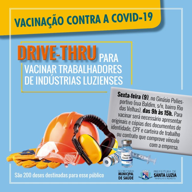 Na próxima sexta-feira (9), a Prefeitura de Santa Luzia irá realizar um drive-thru para vacinar trabalhadores que atuam em indústrias instaladas dentro do município. A ação será no Ginásio Poliesportivo (rua Baldim, s/n, bairro Rio das Velhas), das 9h às 15h. Para vacinar será necessário apresentar originais e cópias dos documentos de identidade, CPF e carteira de trabalho ou contrato que comprove vínculo com a indústria.