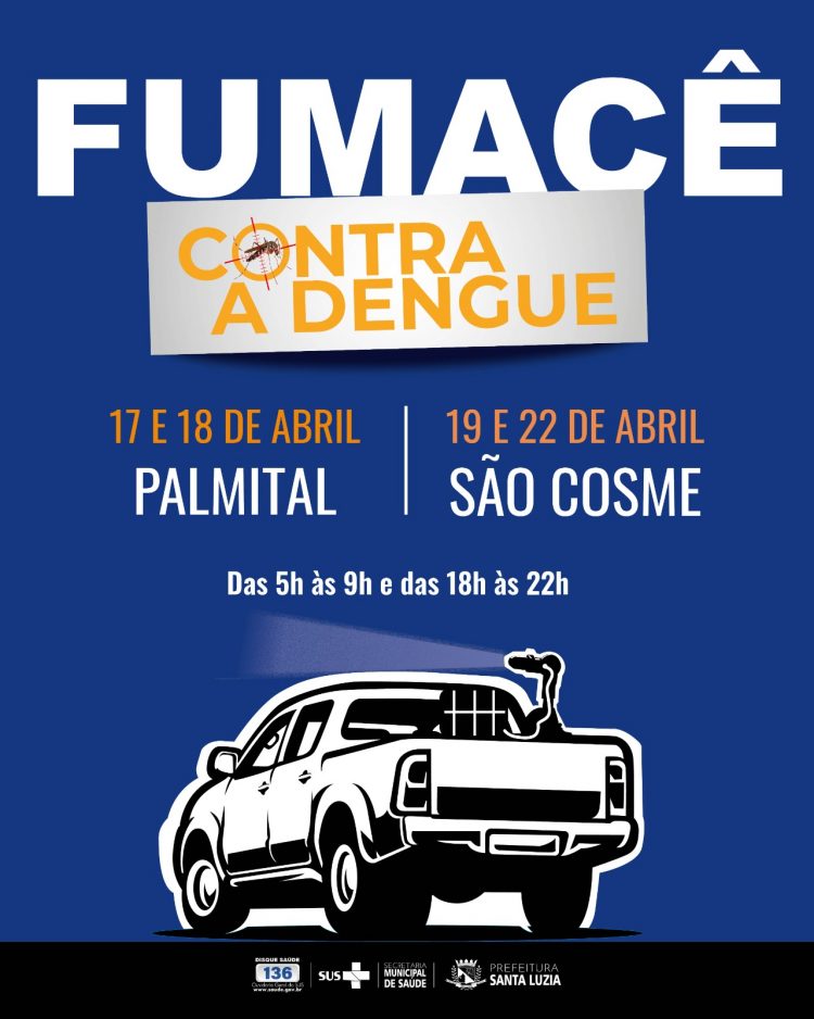 A partir da quarta-feira (17), a Prefeitura de Santa Luzia dará início às operações de combate ao Aedes aegypti, transmissor da dengue, por meio da aplicação de fumacê. Nos dias 17 e 18, quarta e quinta-feira, o fumacê estará no bairro Palmital, começando pela Avenida Inácio Loyola de Oliveira com Avenida João Batista de Lima, das 5h às 9h e das 18h às 22h. Já na sexta-feira (19) e na segunda-feira (22), a ação será no bairro São Cosme, iniciando pela Rua Pindaré com Rua Tangará, no mesmo horário.