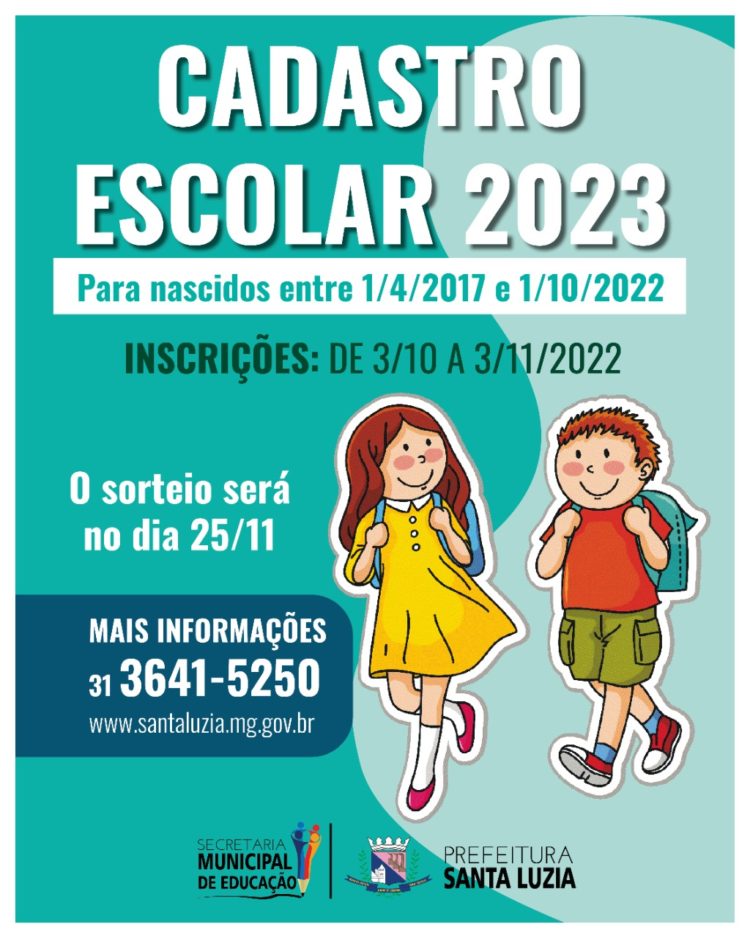 O Cadastramento Escolar 2023 para a Educação Infantil da Rede Municipal de Ensino do município de Santa Luzia deverá ser realizado no site da Prefeitura no link (https://forms.gle/PwhWteFSjg2aPB9t6), ou nas Escolas Municipais de Santa Luzia e UMEIs no período de 03/10 a 03/11/2022.