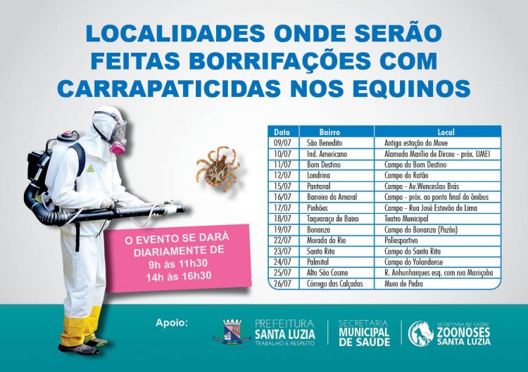 A partir da próxima terça-feira (9), a Prefeitura de Santa Luzia, por meio da Secretaria Municipal de Saúde, inicia a pulverização de carrapaticida em equinos (cavalos e burros), na antiga estação do Move, no bairro São Benedito. A ação acontecerá em pontos estratégicos até o dia 26 de julho e visa a prevenção contra a Febre Maculosa. Quem efetua o serviço é a equipe de Controle em Zoonoses e a cada dia a pulverização será realizada em uma localidade conforme programação, das 9h às 11h30 e das 14h às 16h30.