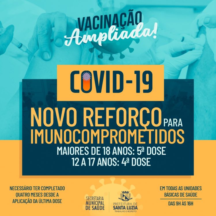 A Prefeitura de Santa Luzia, por meio da Secretaria Municipal de Saúde, convoca os imunocomprometidos com idade a partir de 18 anos para serem vacinados com a quinta dose da vacina contra a covid-19. Todos aqueles que receberam quatro doses e já completaram o intervalo de quatro meses após a última aplicação, devem procurar uma unidade básica de saúde a partir da próxima segunda-feira (29), das 9h às 16h, para receber o imunizante. Adolescentes imunocomprometidos, de 12 a 17 anos, com quatro meses desde a aplicação da última dose de reforço, também deverão receber mais uma aplicação da vacina.