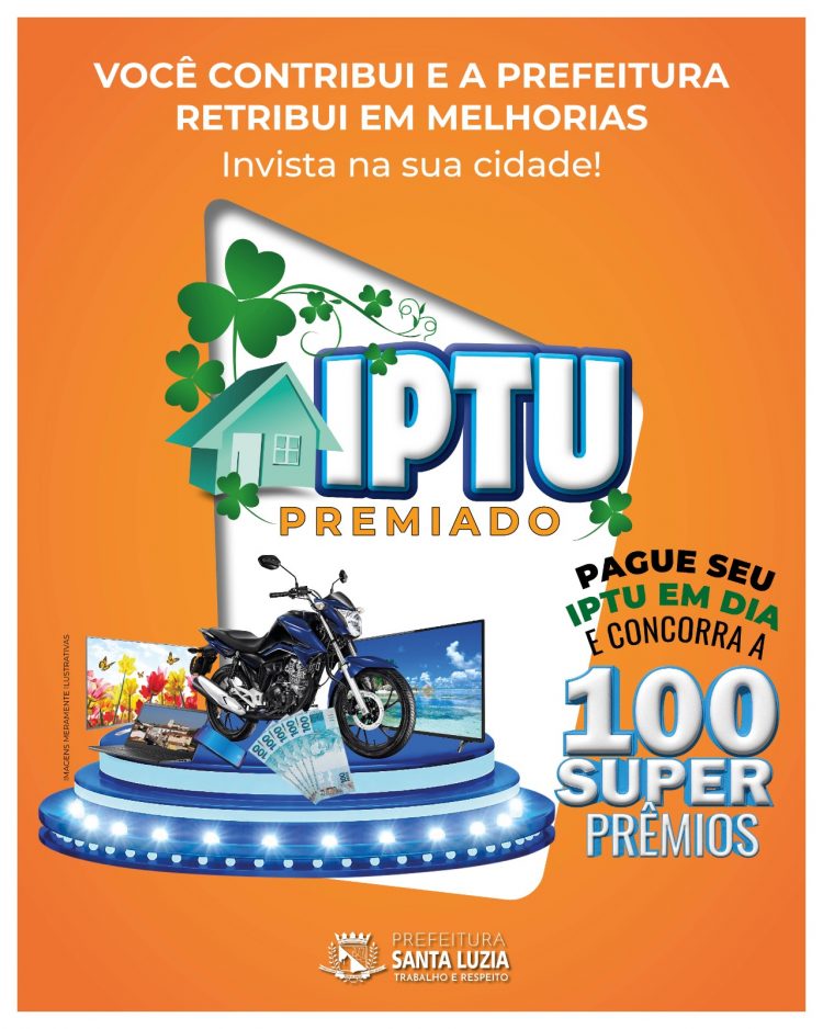 A Prefeitura de Santa Luzia irá premiar os contribuintes que estiverem em dia com o Imposto sobre a Propriedade Predial e Territorial Urbana (IPTU), com o programa “IPTU Premiado”. Serão sorteados 100 prêmios, entre eles uma motocicleta no valor de R$ 20.000,00 (vinte mil reais).