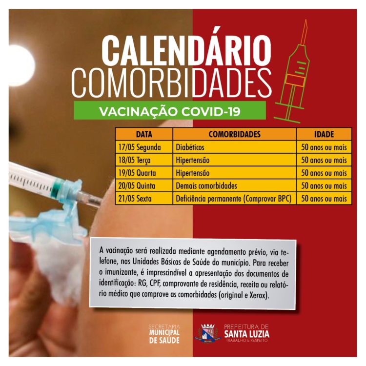 A prefeitura de Santa Luzia, por meio da secretaria municipal de Saúde informa que a partir da próxima segunda-feira (17), um novo grupo prioritário começará a ser vacinado contra a covid-19 no município. O público-alvo a ser imunizado neste momento é composto por pessoas a partir de 50 anos portadoras de comorbidades. Para evitar aglomerações nas Unidades Básicas de Saúde e conter a disseminação do novo coronavírus foi montado um calendário para a vacinação.