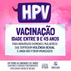 A Prefeitura de Santa Luzia, através da Secretaria Municipal de Saúde, anuncia a disponibilidade da vacinação contra o HPV em todas as Unidades Básicas de Saúde para indivíduos que sofreram violência sexual que possuem idade entre 9 e 45 anos, e ainda não tenham recebido a imunização contra esta doença.