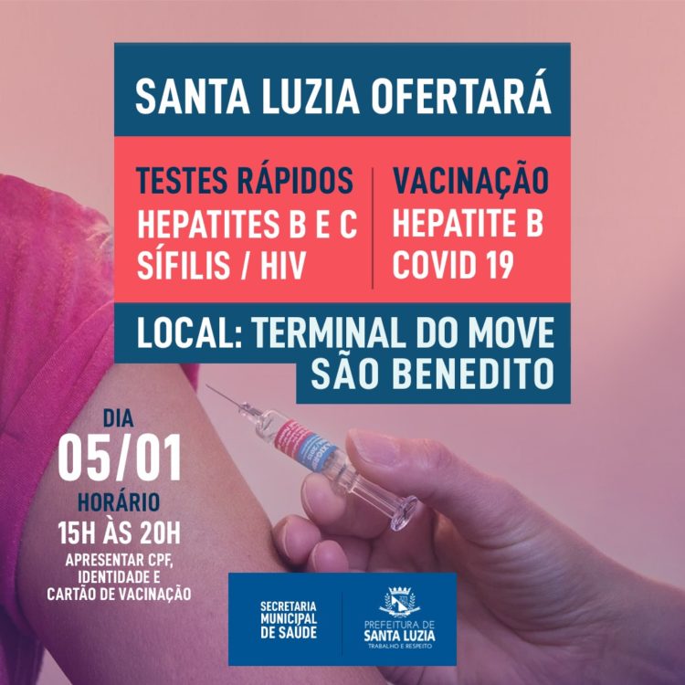 Uma iniciativa da Prefeitura de Santa Luzia, através da secretaria de Saúde, ofertará à população testes rápidos para HIV, sífilis, hepatites B e C, e vacinação contra a Hepatite B e Covid 19 também no Terminal MOVE São Benedito. A ação se dará na quarta-feira, 05 de Janeiro de 2022, das 15h00 às 20h00. Os interessados deverão apresentar CPF, identidade e cartão de vacinação.