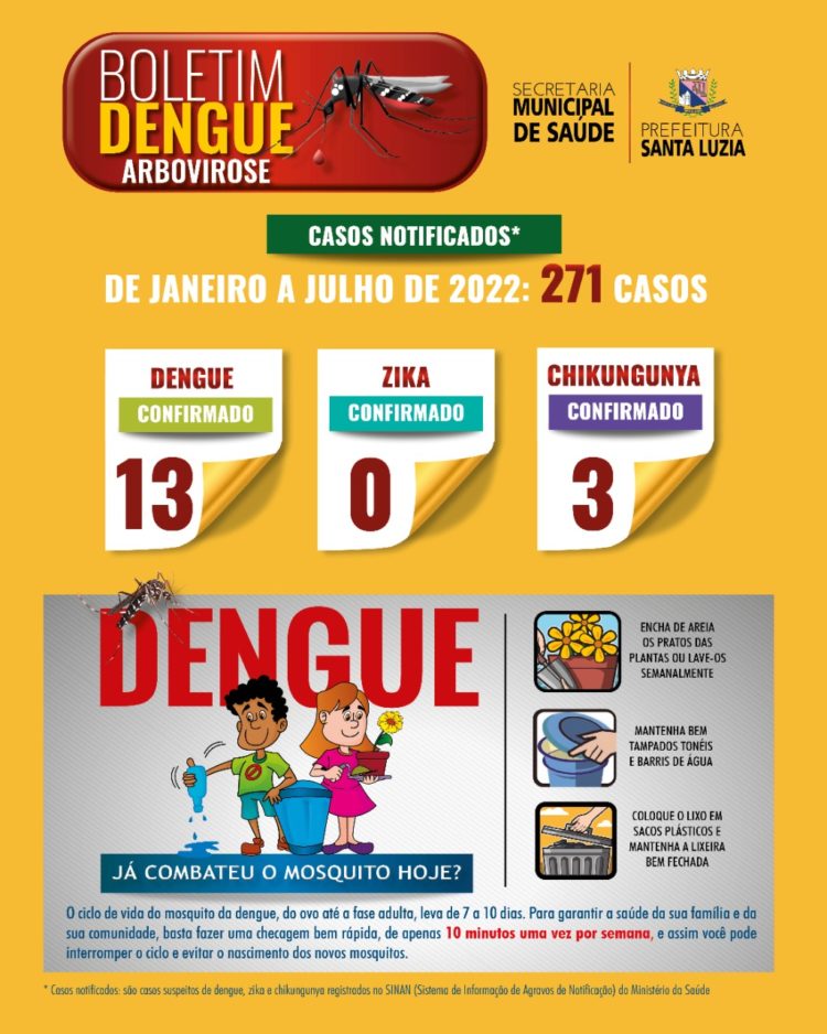 De janeiro a julho, foram feitas pela equipe de Vigilância Epidemiológica 271 notificações de arboviroses (doenças causadas por vírus transmitidos principalmente por mosquitos), sendo que, destas, 13 confirmadas para dengue e 3 para chikungunya. Esses números representam um decréscimo nos casos de infecção, o que se deve às medidas de prevenção, tais como borrifações, ações educativas nas áreas críticas, operações “pente fino” pelos ACE – Agentes de Combate a Endemias, dentre outros, além da colaboração dos munícipes.