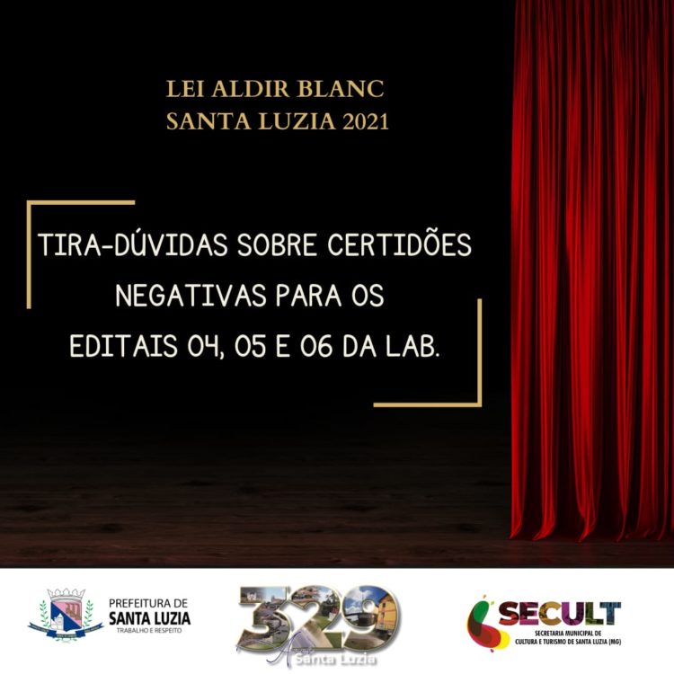 A Prefeitura de Santa Luzia, por meio da secretaria Municipal de Cultura e Turismo elaborou um documento para nortear os agentes culturais, coletivos e entidades nas buscas pelas certidões indispensáveis para a participação nos editais 04, 05, 06 da Lei Aldir Blanc 2021. Os editais são destinados à cadeia produtiva da arte e cultura e os certames contemplarão os agentes culturais que sejam residentes no município ou que aqui exerçam as suas atividades profissionais com prêmios e bolsas de capacitação no valor superior a 1 milhão e 340 mil reais. As certidões de demais documentos para a participação no processo podem ser acessados pelo link: bit.ly/3F5VMib