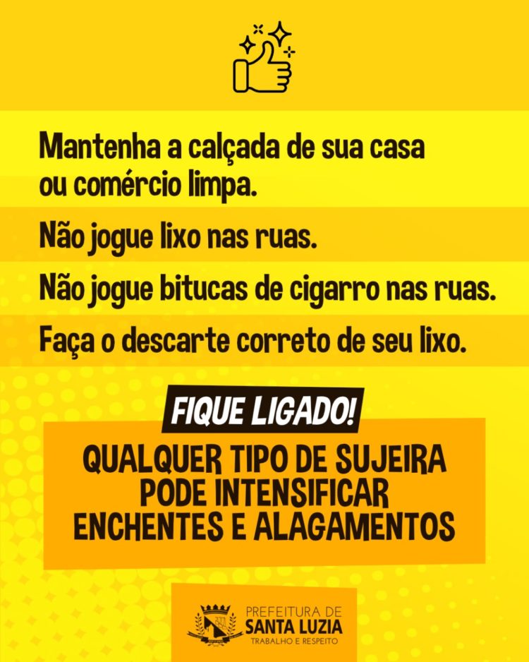 Tendo em vista o período chuvoso, a Prefeitura de Santa Luzia tem se esforçado para minimizar os impactos à população. Os serviços de manutenção das ruas e avenidas estão sendo realizados de forma constante, e para evitar enchentes e alagamentos, todos precisam colaborar. Pequenos hábitos podem fazer a diferença. Qualquer cidade só ficará limpa se cada um mantiver a calçada e o meio-fio permanentemente limpos em toda a extensão do seu imóvel ou comércio.