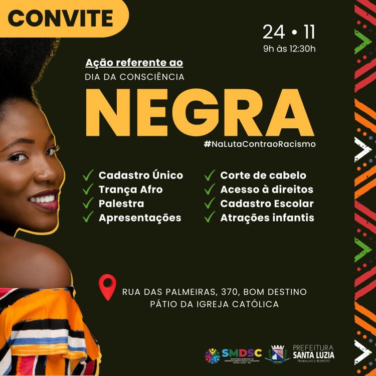 No dia 20 de novembro, comemora-se o Dia Nacional de Zumbi e da Consciência Negra, instituído pela Lei 12.519/2011. Pensando na importância desta data, a Prefeitura, por meio da Secretaria Municipal de Desenvolvimento Social e Cidadania e do CRAS Bom Destino irá realizar nesta sexta (24) uma ação de conscientização ao tema, juntamente com a população de Santa Luzia. O evento será na rua das Palmeiras, 370, Bairro Bom Destino. Haverá apresentações culturais, palestras, atrações infantis, trança afro, corte de cabelo e atualização e inscrição do Cadastro Único.