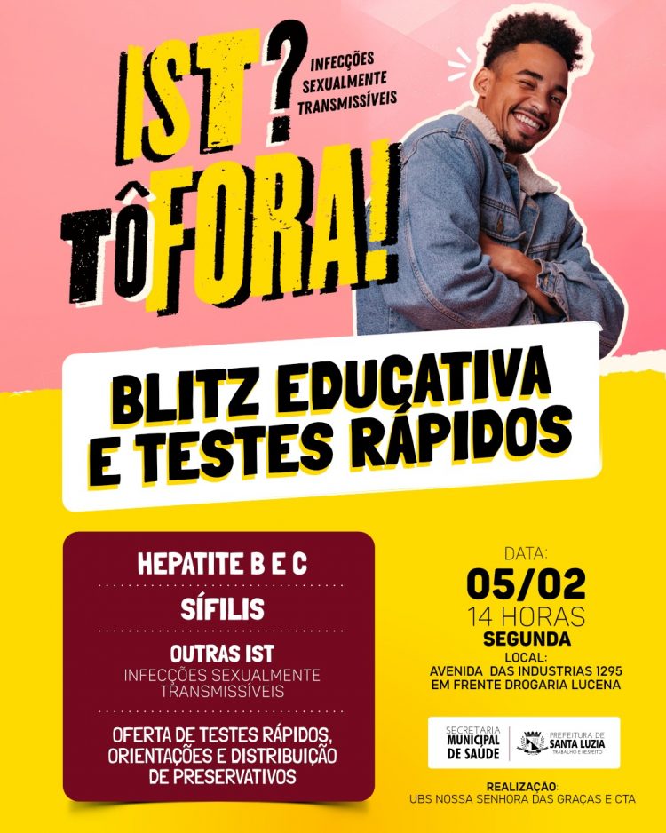Nesta segunda-feira (5), a partir das 14h, a Prefeitura irá promover uma blitz educativa com orientações e testes rápidos de hepatite, sífilis e outras infecções sexualmente transmissíveis (ISTs). A ação será na Avenida das Indústrias, 1.295, em frente à Drogaria Lucena. A iniciativa é da unidade básica de saúde Nossa Senhora das Graças e do Centro de Testagem e Aconselhamento.