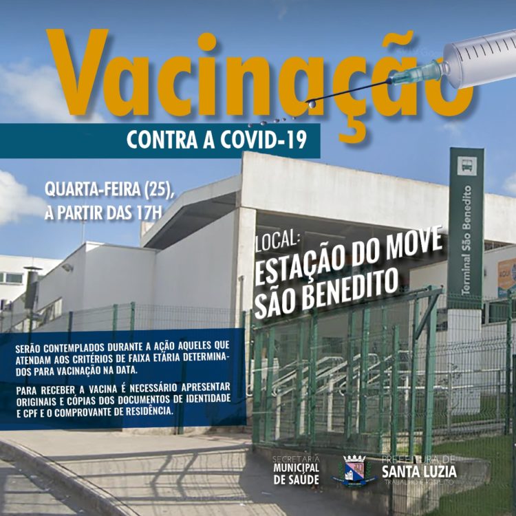 Com o objetivo de atender a população que trabalha em outras cidades e tem dificuldade de procurar uma unidade básica de saúde durante a semana, a Prefeitura de Santa Luzia, por meio da Secretaria Municipal de Saúde promoverá na quarta-feira (25), a partir das 17h, vacinação contra a covid-19 dentro da estação do Move São Benedito, no bairro Cristina.
