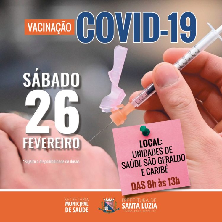 A Prefeitura de Santa Luzia, por meio da Secretaria Municipal de Saúde segue com a vacinação contra a covid-19 aos sábados para garantir que toda população tenha acesso à vacinação. Duas unidades básicas de saúde ficam abertas das 8h às 13, a unidade Caribé e São Geraldo. Serão aplicadas a primeira, segunda e terceira doses para aqueles que ainda não receberam o imunizante.