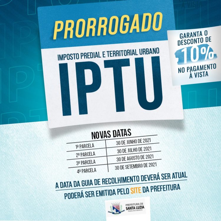 Em razão da grande procura e de dificuldades de acesso ao boleto que muitos deixaram para o último dia, a Prefeitura de Santa Luzia prorrogou o prazo de vencimento para pagamento do Imposto Sobre a Propriedade Predial e Territorial Urbano – IPTU, juntamente com a Taxa de Coleta de Resíduos Sólidos – TCRS do ano de 2021. Os contribuintes podem efetuar o pagamento do tributo municipal até o dia 30 de junho de 2021 em quota única com desconto de 10% (dez por cento).