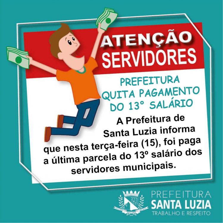 A Prefeitura de Santa Luzia informa que nesta terça-feira (15), foi paga a última parcela do 13º salário dos servidores municipais.