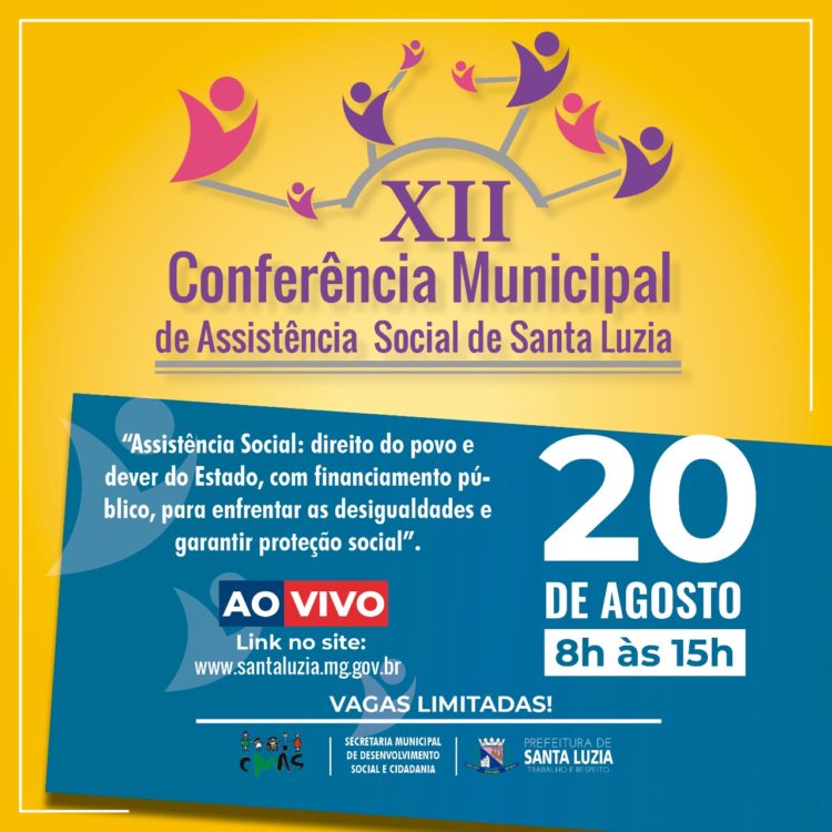 A Prefeitura de Santa Luzia, por meio da Secretaria Municipal de Desenvolvimento Social e Cidadania, realizará no dia 20 de agosto a 12ª Conferência Municipal de Assistência Social de Santa Luzia, a qual desta vez, excepcionalmente, devido à pandemia da covid-19 ocorrerá de forma híbrida, podendo o público participar por meio de aplicativos de videoconferência ou presencialmente, com vagas limitadas.