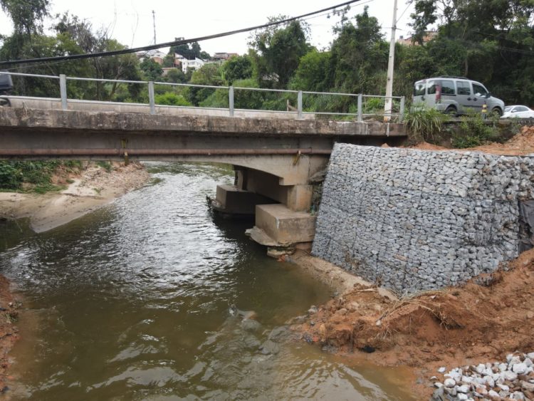Nesta terça-feira (14) máquinas trabalham na construção de um muro de contenção em gabião. No local serão executadas duas contenções. Na ponte próxima ao bairro Duquesa II, as obras de reforço já foram concluídas.