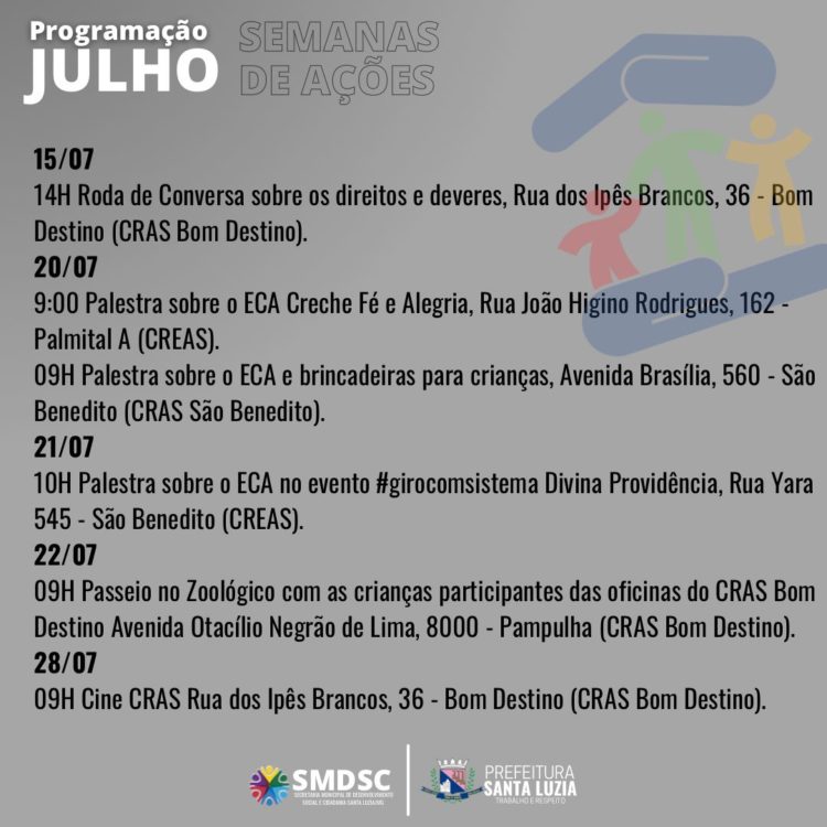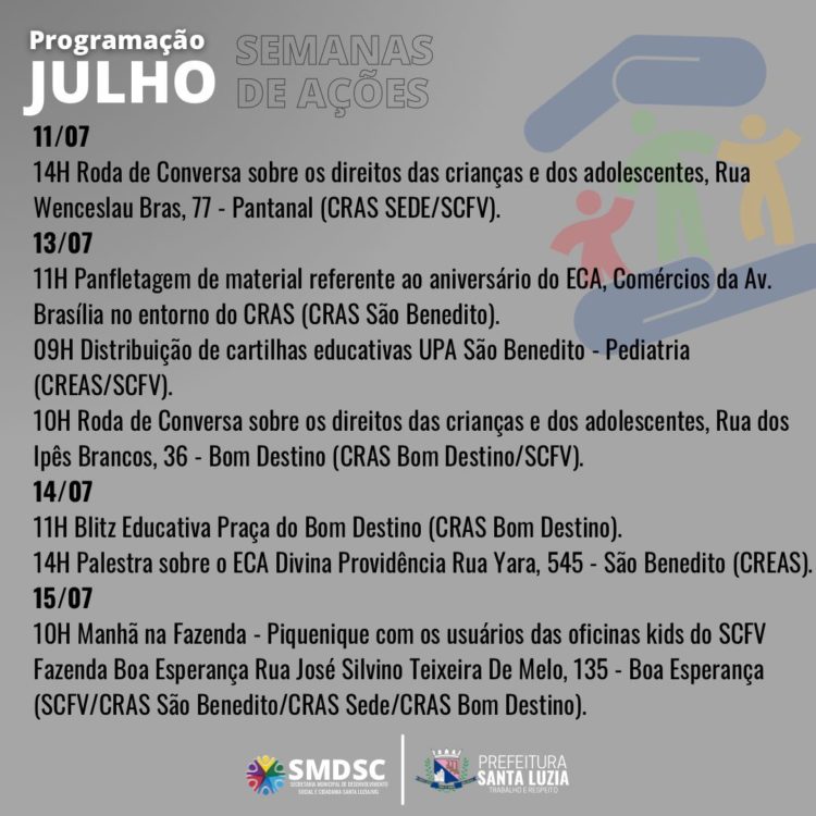 A Prefeitura de Santa Luzia, por meio da Secretaria de Desenvolvimento Social e Cidadania vai promover durante todo o mês de julho, nos equipamentos da Assistência Social, diversas ações para celebrar a importância do Estatuto da Criança e do Adolescente. A iniciativa tem como objetivo conscientizar, prevenir, sensibilizar, informar, debater e, principalmente, lembrar a toda a rede de proteção à infância o compromisso com as crianças e adolescentes.