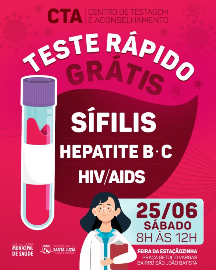 A Prefeitura de Santa Luzia, por meio da Secretaria Municipal de Saúde irá promover no próximo sábado (25), das 8h às 12h, na Praça Getúlio Vargas, a oferta de testes rápidos para HIV, sífilis, hepatite B e hepatite C. As testagens serão realizadas gratuitamente e tem por objetivo ampliar o acesso ao diagnóstico das infecções sexualmente transmissíveis – IST’s. Os resultados dos testes rápidos são fornecidos na hora.