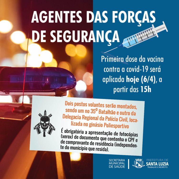 Nesta terça-feira (06), a partir das 15 horas, acontecerá a primeira fase de vacinação dos servidores da ativa das Forças de Segurança que trabalham em Santa Luzia e estão cadastrados na lista oficial do comando na cidade. Foram considerados como critério das Forças de Segurança os Policiais Militares, Bombeiros, Policiais Civis, Penais e Guardas Municipais.