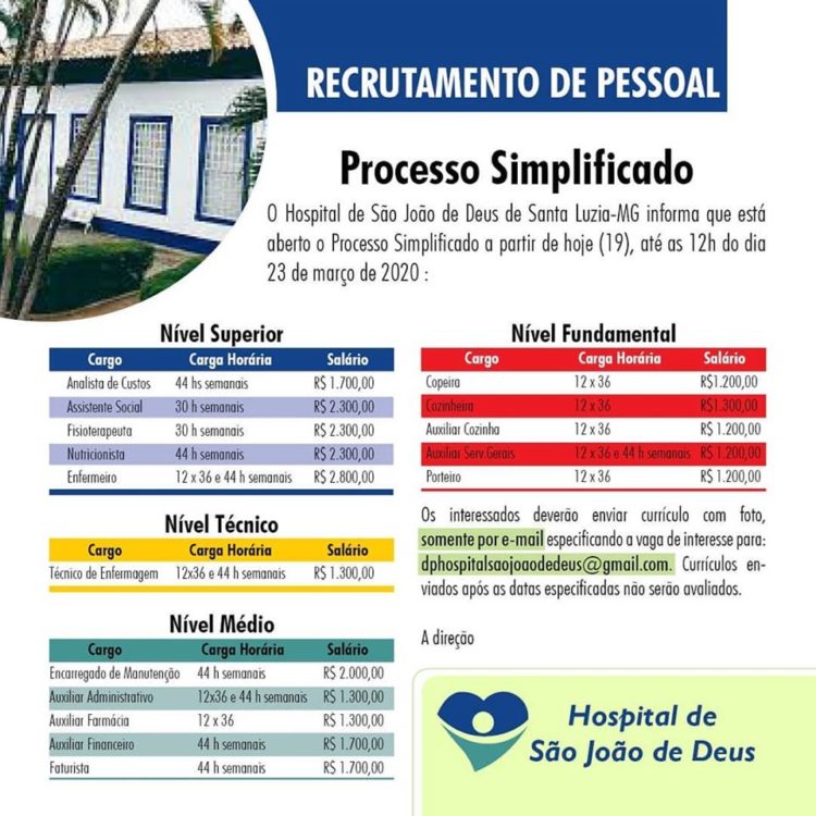 Os interessados deverão enviar currículo com foto, especificando a vaga de interesse, para o email: dphospitalsaojoaodedeus@gmail.com