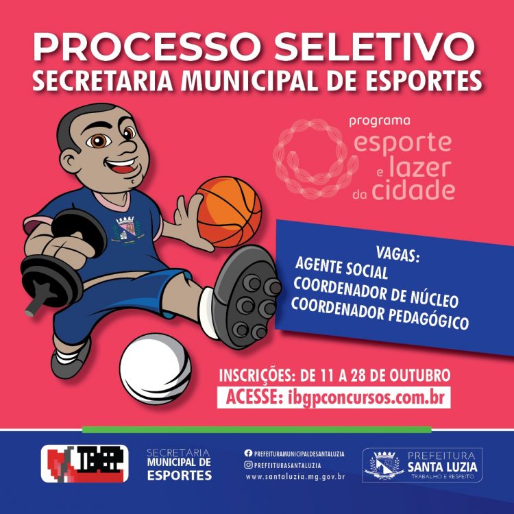 A Prefeitura de Santa Luzia, por meio da Secretaria Municipal de Esportes está com novo processo seletivo simplificado aberto para contratação de profissionais para atuarem no Programa Esporte e Lazer da Cidade – PELC. O programa é gerido pela Prefeitura, em conformidade com convênio firmado com o Governo Federal.