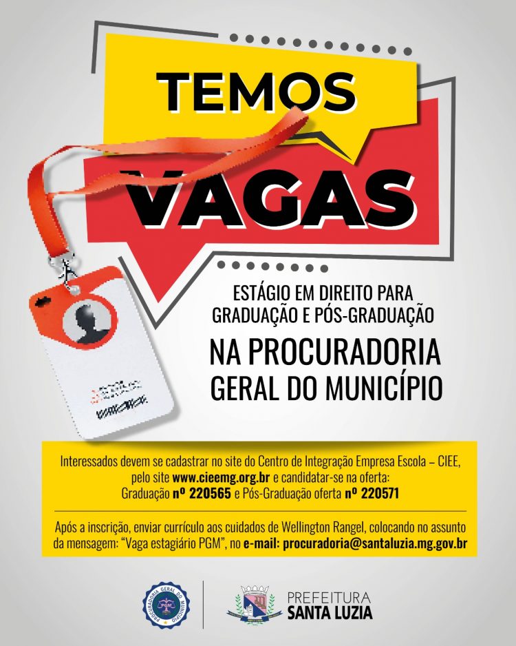 A Procuradoria Geral Municipal de Santa Luzia informa que estão abertas vagas de estágio para estudantes de graduação e pós-graduação em Direito. Para as vagas de graduação, os candidatos devem estar cursando a partir do 5° período da faculdade.