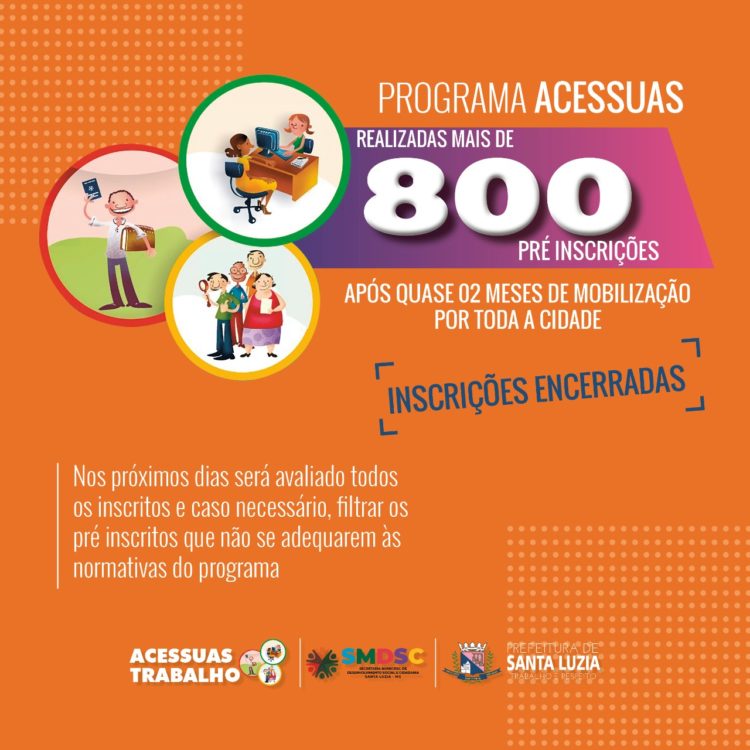 A Prefeitura de Santa Luzia, por meio da Secretaria de Desenvolvimento Social e Cidadania está executando o programa ACESSUAS Trabalho e após quase 02 meses de mobilização por toda a cidade (atendimento nos equipamentos da assistência, agendas com usuários de instituições, carro de som divulgando às ações, entre outros) foram realizadas mais de 800 pré inscrições.