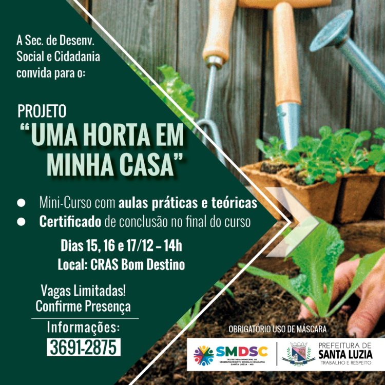 A Prefeitura por meio da Secretaria de Desenvolvimento Social e Cidadania, em parceria com a Secretaria de Meio Ambiente, através do Projeto Horta Luziense, implantou em agosto deste ano uma atividade piloto no CREAS (Projeto SEMEAR) e agora se estende ao CRAS Bom Destino, com o PROJETO “UMA HORTA EM MINHA CASA”.