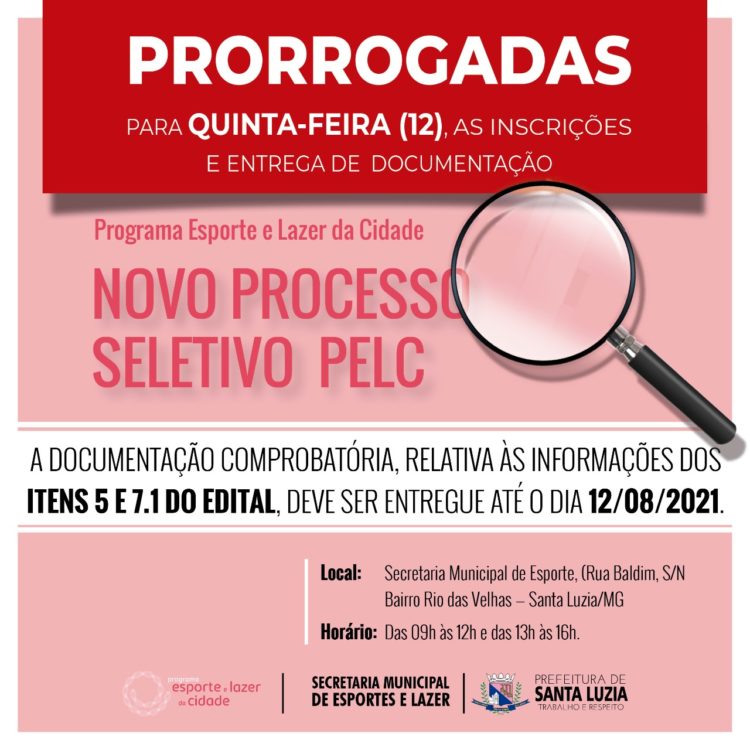 A Prefeitura de Santa Luzia, por meio da secretaria municipal de Esporte e Lazer informa a prorrogação das inscrições e entrega de documentação para a participação no processo seletivo do PELC – Programa Esporte e Lazer da Cidade. As vagas são divididas em: Agente social dançarino (a) (10); Agente social capoeira (2); Agente social esportista (10); Agente social cultural e artístico (6); Agente social exercícios físicos (10); Agente social jogos e brincadeiras (9); Agente social artes marciais (13); com exigência apenas do ensino médio completo, além de vagas para coordenador de núcleo (10), que exige formação superior na área de esporte e lazer e coordenador pedagógico (1), sendo necessária formação em pedagogia.