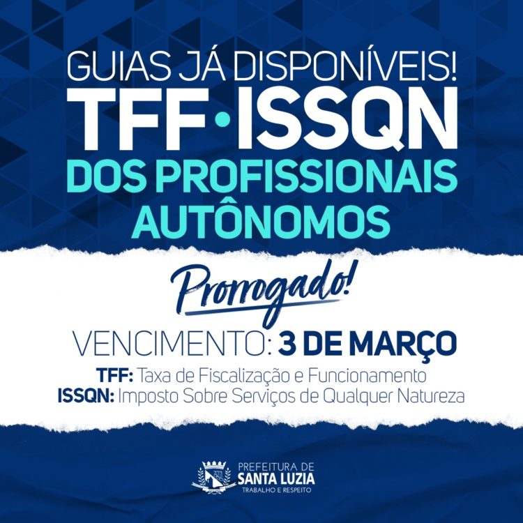 A Prefeitura de Santa Luzia liberou, no dia 31 de janeiro, as guias para o pagamento das taxas de Fiscalização e Funcionamento (TFF) e do Imposto Sobre Serviços de Qualquer Natureza (ISSQN) dos profissionais autônomos do exercício de 2023. Estas guias estão disponíveis para consulta no site oficial da prefeitura através do link bit.ly/3YhdYis.