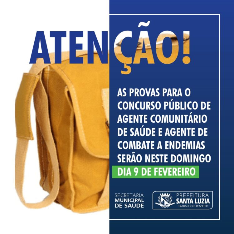 As provas para o concurso público da área da Saúde de Santa Luzia será neste domingo (9). Ao todo, são 281 vagas, além do cadastro de reserva, para os cargos de Agente Comunitário de Saúde (ACS) e Agente Combate a Endemias (ACE). As provas que seriam realizadas no último dia 26 foram canceladas devido às fortes chuvas que assolaram o município. Os locais das provas e horários permanecem os mesmos. Acesse o link e obtenha todas as informações sobre o certame: bit.ly/2veqGGq
