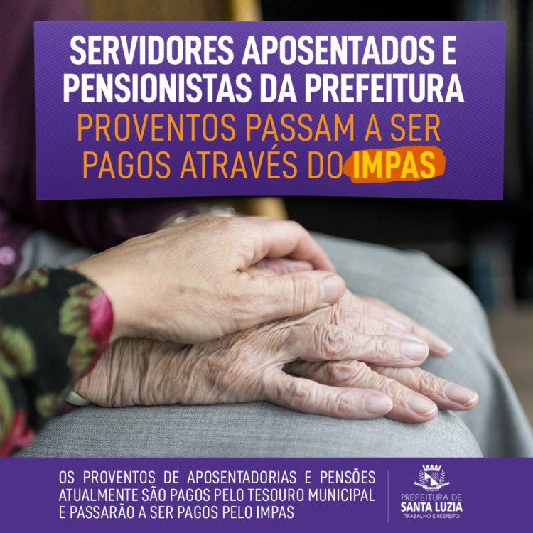 Os proventos de aposentadorias e pensões atualmente pagos pelo Tesouro Municipal passarão a ser pagos pelo Instituto Municipal de Previdência e Assistência Social dos Servidores Públicos de Santa Luzia, IMPAS de acordo com a Lei nº 4.356, de 03 de dezembro de 2021.
