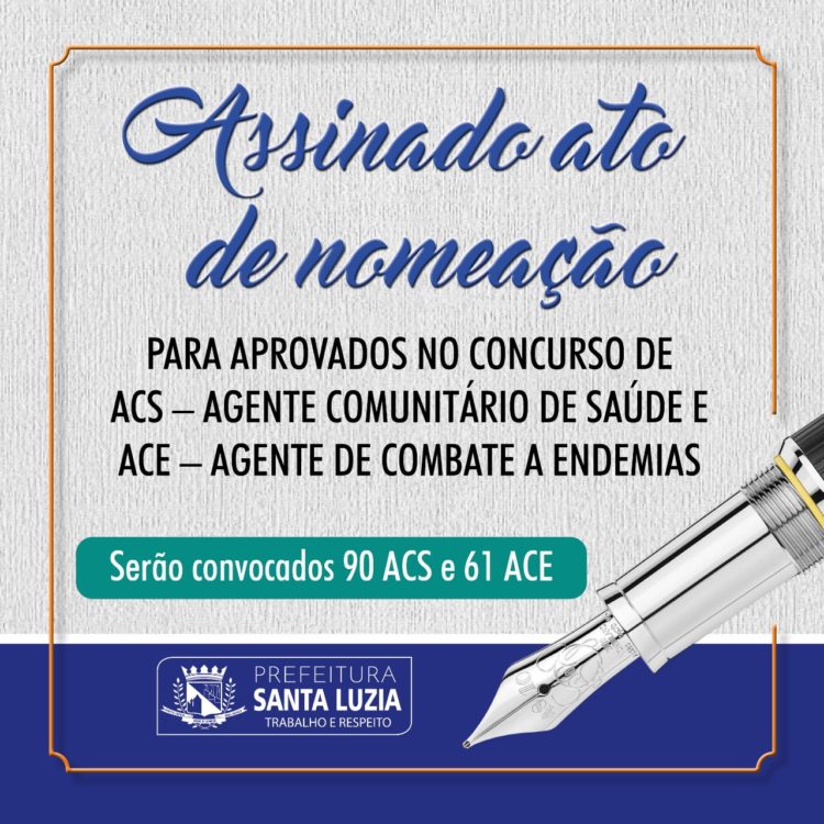 Após homologação do Concurso Público da Secretaria Municipal de Saúde, acaba de ser assinado pelo Prefeito de Santa Luzia, o ato de nomeação do Concurso Público para ACS – Agente Comunitário de Saúde e ACE – Agente de Combate a Endemias. O certame ofertou 281 vagas, além do cadastro de reserva e foi realizado em duas etapas: a primeira foi à aplicação de prova objetiva de múltipla escolha e a segunda etapa consistiu na realização do curso de formação introdutória básica.