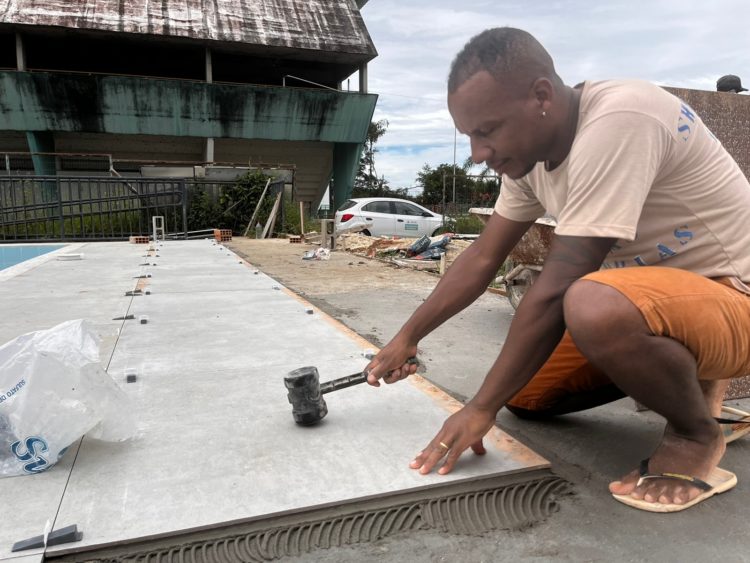 A reforma da piscina do Ginásio Poliesportivo de Santa Luzia está a todo vapor. Nesta quinta-feira (19), equipes trabalham no assentamento do piso em porcelanato atérmico antiderrapante ao redor da área externa e também na rampa de acesso. A área total a ser instalada perfaz um total de aproximadamente 225 m².