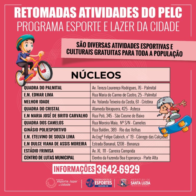 Com o objetivo de incentivar a prática esportiva e promover atividades culturais e de lazer, o PELC – gerenciado pela Prefeitura de Santa Luzia retomou as atividades nesta segunda (24). O programa oferta diversas modalidades esportivas em vários núcleos e subnúcleos espalhados por todas as partes da cidade. Dentre as atividades ofertadas estão: ginástica funcional dança, jogos e brincadeiras, futsal, voleibol, futebol, futsal infantil, taekwondo Kids, ginástica funcional, peteca, boxe, entre outros.