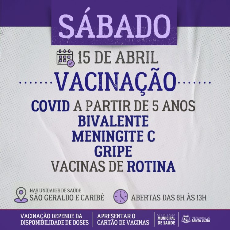 Neste sábado (15) tem vacinação nas unidades básicas de saúde São Geraldo e Caribé, das 8h às 13h. Estarão disponíveis imunizantes de rotina, contra a influenza, meningite C e contra a covid-19: para população acima de 5 anos de idade e a bivalente para os públicos elegíveis. A vacinação depende da disponibilidade de doses.