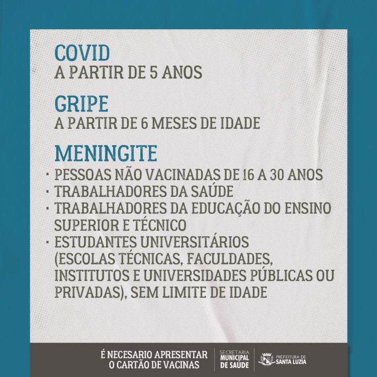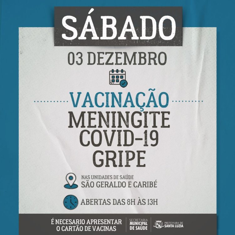 Neste sábado (3), das 8h às 13h, os postos de saúde Caribé e São Geraldo, estarão abertos para a população atualizar o cartão de vacinas, receber as doses de rotina e os três imunizantes que estão em campanha, para: meningite C, covid-19 e influenza (gripe).