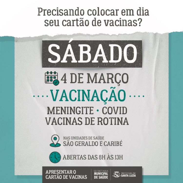 Está precisando colocar em dia seu esquema vacinal contra a covid ou qualquer outra doença? Neste sábado (3) as unidades básicas de saúde Caribé e São Geraldo estarão abertas das 8h às 13h, ofertando vacinas de rotina, contra a meningite C e contra covid-19 para crianças de 5 a 11 anos, adolescentes e adultos a partir dos 12 anos. A vacina bivalente para pessoas maiores de 70 anos, imunocomprometidos e todos os outros grupos elegíveis também estará disponível.