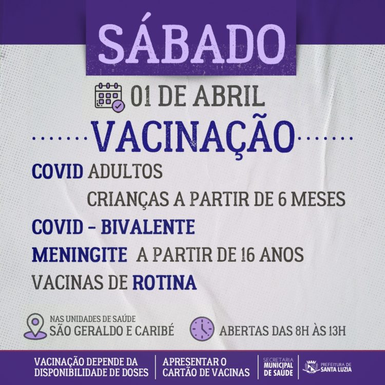 Neste sábado (1º), as unidades de Saúde São Geraldo e Caribé, estarão abertas, das 8h às 13h, para vacinação da população luziense. Estarão disponíveis vacinas de rotina contra meningite C e contra covid-19.
