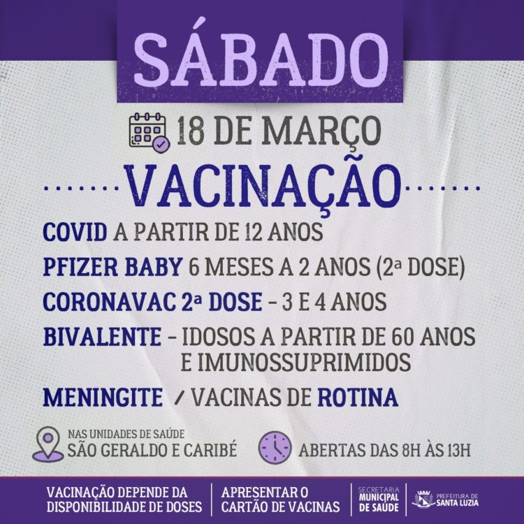Como acontece semanalmente, neste sábado (18) as unidades básicas de saúde São Geraldo e Caribé, estarão abertas das 8h às 13h para vacinar a população. Estarão disponíveis vacinas de rotina, contra meningite C e contra a covid-19 para os seguintes públicos: pessoas a partir de 12 anos (qualquer dose), 2ª dose para bebês de 6 meses a 2 anos, 2ª dose para crianças de 3 e 4 anos (coronavac) e bivalente para idosos a partir de 60 anos, imunocomprometidos e todos os outros grupos elegíveis. A vacinação depende da disponibilidade de doses.
