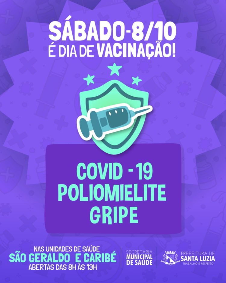 Neste sábado (8), as unidades básicas de saúde São Geraldo e Caribé estarão abertas novamente para a vacinação contra a gripe, covid-19 e poliomielite. Os dois postos de saúde ficam abertos das 8h às 13h e para se vacinar é necessário apresentar o cartão de vacinas.