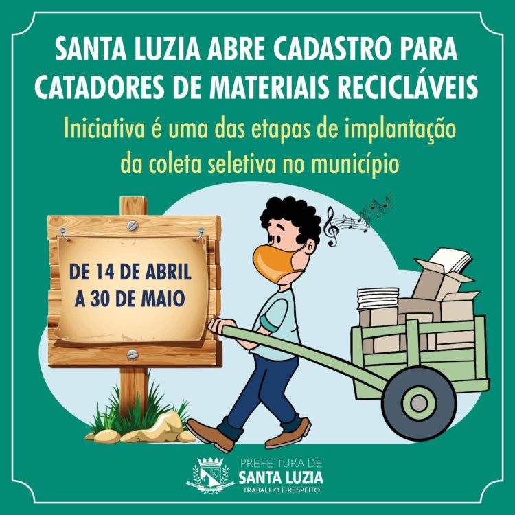 Uma iniciativa da Prefeitura de Santa Luzia, através das Secretarias Municipais de Meio Ambiente e de Desenvolvimento Social vai propiciar o início da implantação da Coleta Seletiva no município. Uma das etapas é o cadastro para catadores de materiais recicláveis, promovido pelo social e já publicado no site oficial da Prefeitura (https://bit.ly/3se4MLz) e disponibilizado nos Centros de Referências – CRAS a partir de hoje, 14 de abril até o dia 30 de maio.