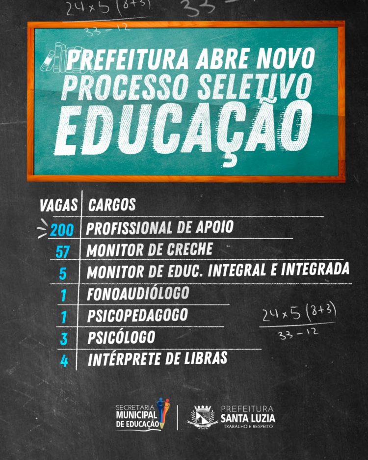 A Prefeitura de Santa Luzia, por intermédio da Secretaria Municipal de Educação, torna pública, a abertura do edital 01/2023, para novo Processo Seletivo Simplificado, destinado a selecionar candidatos para contratação temporária de níveis Superior e Médio, sendo os cargos disponíveis: profissional de apoio (200), monitor de creche (57), monitor de educação integral e integrada (5), fonoaudiólogo (1), psicopedagogo (1), psicólogo (3) e intérprete de libras (4).