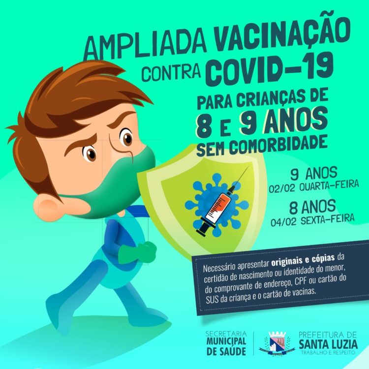 A Prefeitura de Santa Luzia, por meio da secretaria municipal de Saúde informa a ampliação da vacinação contra a covid-19 para crianças sem comorbidades. A partir desta quarta-feira (2), quem já completou 9 anos poderá receber a primeira dose do imunizante e na sexta-feira (4) será a vez do público infantil de 8 anos. Crianças com comorbidades ou deficiência permanente de 5 a 11 anos também podem se vacinar.
