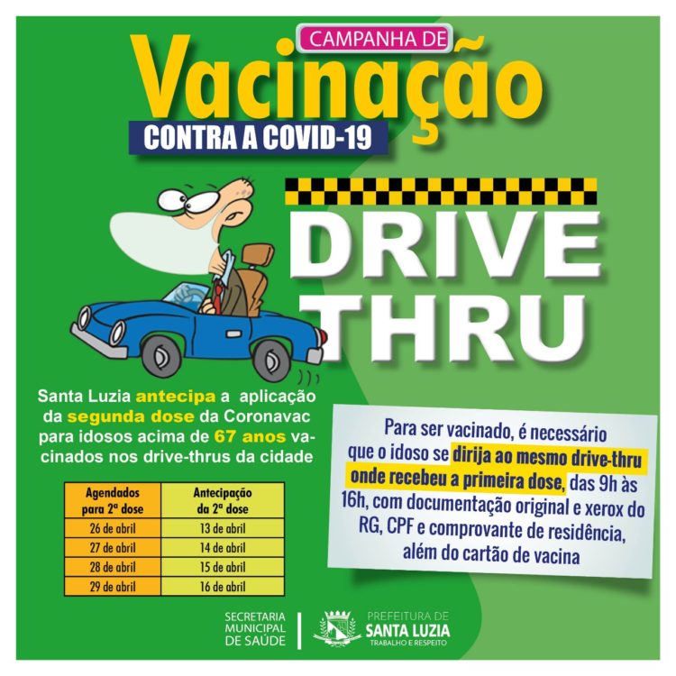 A Prefeitura de Santa Luzia, por meio da secretaria municipal de Saúde informa que foi antecipada para esta semana, a aplicação da segunda dose da vacina contra a Covid-19 para idosos acima de 67 anos, que receberam a primeira dose da Coronavac nos drive-thrus da cidade, montados no SESC, da Avenida Brasília e no ginásio Poliesportivo, no bairro Baldim, respeitado o intervalo de 15 dias.