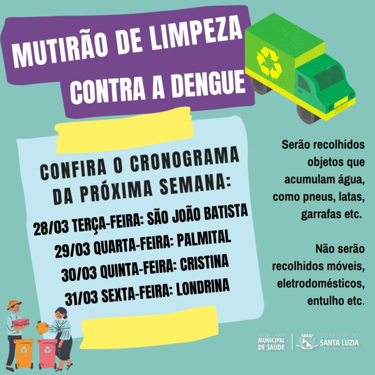 A partir de terça-feira (28), caminhões da Limpeza Urbana estarão coletando inservíveis (todo objeto que possa acumular água) nos bairros mais afetados. A ação começará pelo bairro São João Batista na terça-feira (28) e seguirá no Palmital na quarta-feira (29), no Cristina na quinta-feira (30) e no Londrina na sexta-feira (31). As datas da operação nos bairros Frimisa e Dona Rosarinha serão divulgadas em breve. A Prefeitura pede para que a população destes bairros coloque na calçada objetos que possam servir de criadouro para o mosquito para que sejam recolhidos pelo caminhão da Prefeitura. A coleta começa às 9h.