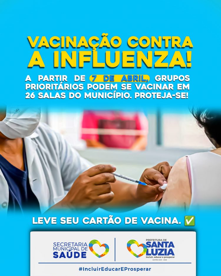 A Prefeitura de Santa Luzia, por meio da Secretaria de Saúde, dará início à Campanha Nacional de Vacinação contra a Influenza (gripe) na próxima segunda-feira, 7 de abril. A imunização é uma das principais medidas de proteção contra o vírus e contribui para reduzir a circulação da doença, além de ajudar a diferenciar os sintomas da gripe dos sintomas da Covid-19.