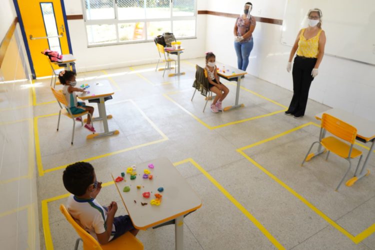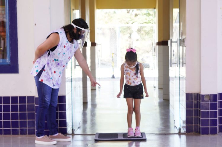 Nesta segunda-feira (7), duas escolas (nas quais também funciona a educação infantil) e quatro UMEIs (Unidades Municipais de Educação Infantil) de Santa Luzia retomaram as aulas presenciais para os alunos dos 1º e 2º períodos da educação fundamental, estudantes com idades entre 4 e 5 anos. Para que o retorno à classe de aula dos pequenos fosse possível, todos os procedimentos de segurança estabelecidos pelo MEC e pela secretaria estadual da Educação (disponíveis na página do FNDE) tiveram de ser observados e incluem: tomada da temperatura, uso do álcool em gel, redução no número de alunos por sala e uso de máscara, dentre outros.